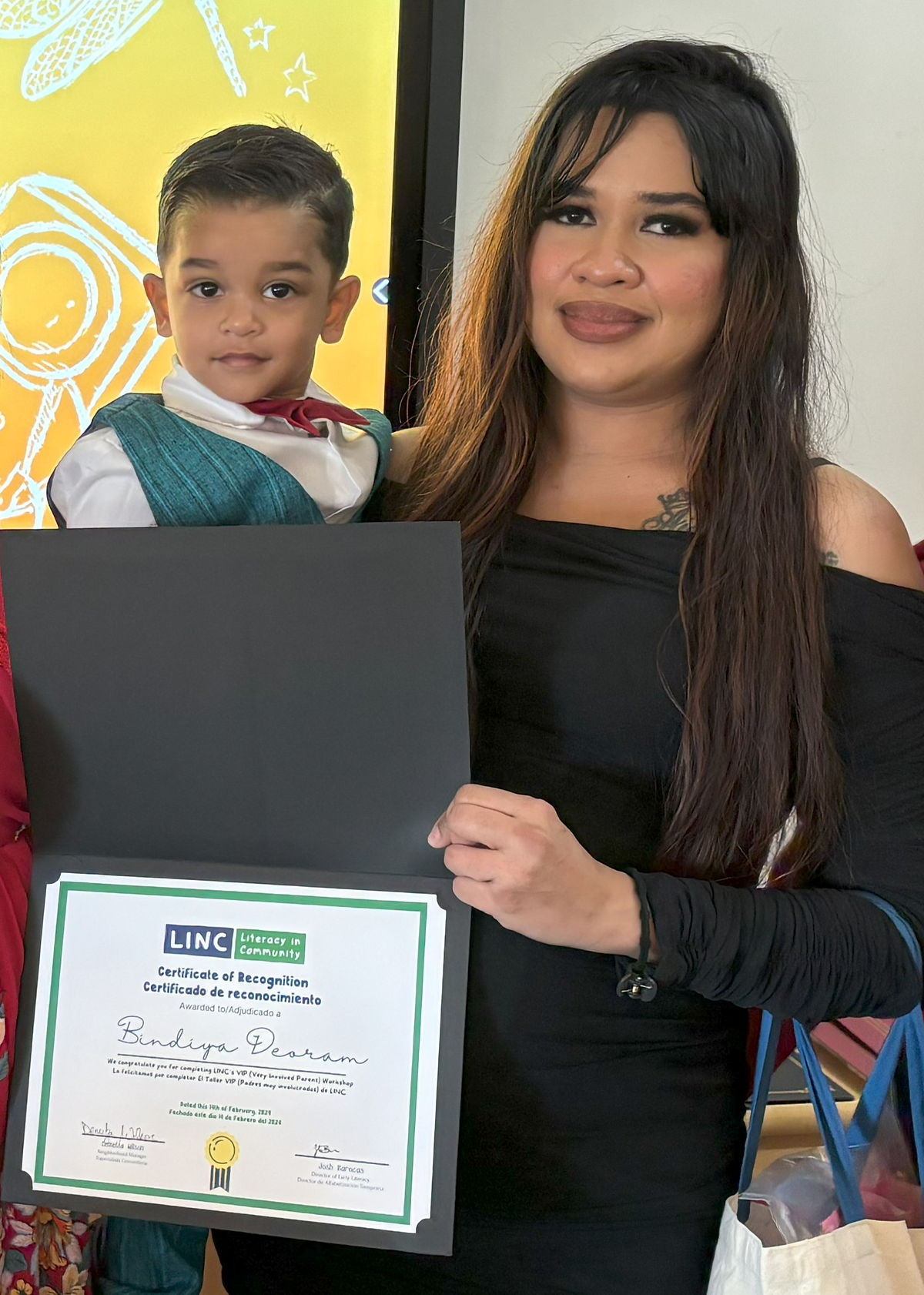 In February of this year, Bindiya, a mother of four sons in South Jamaica, Queens completed her training to become a LINC Very Involved Parent (VIP). While her sons (ages 7, 5, 3, and 7 months) are what initially motivated her to attend LINC programs beginning in 2022, her journey has led her to become a notable literacy advocate in her community.